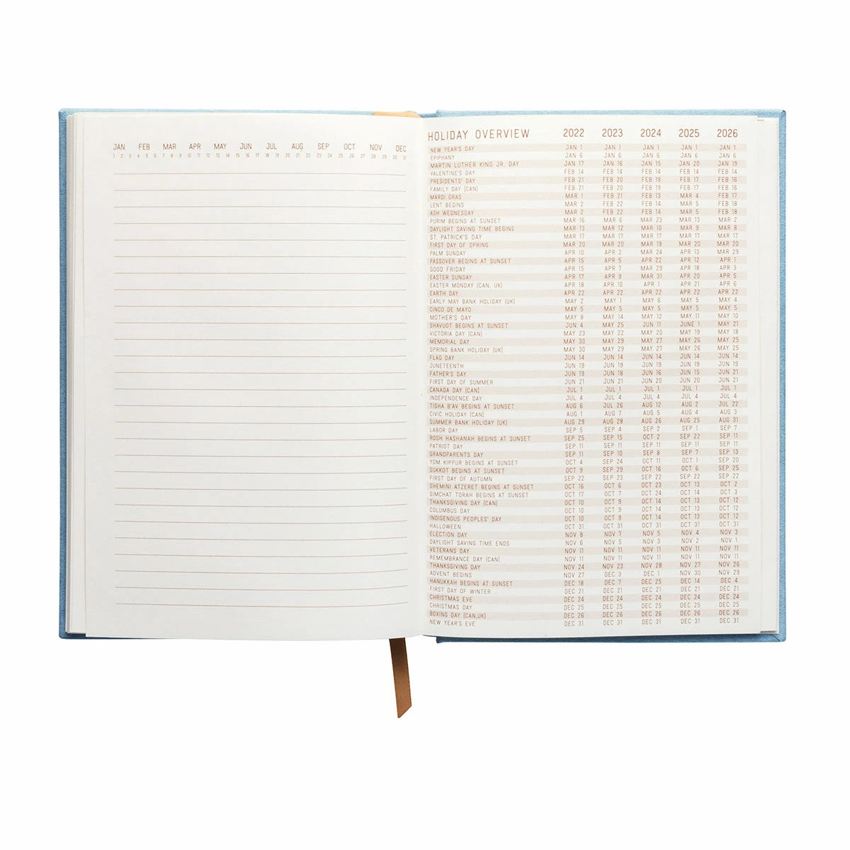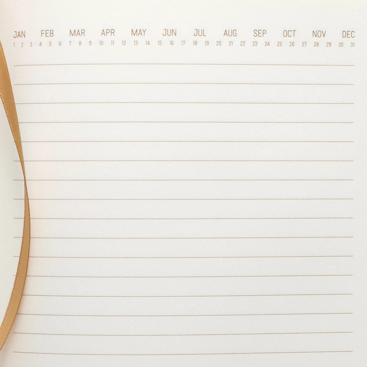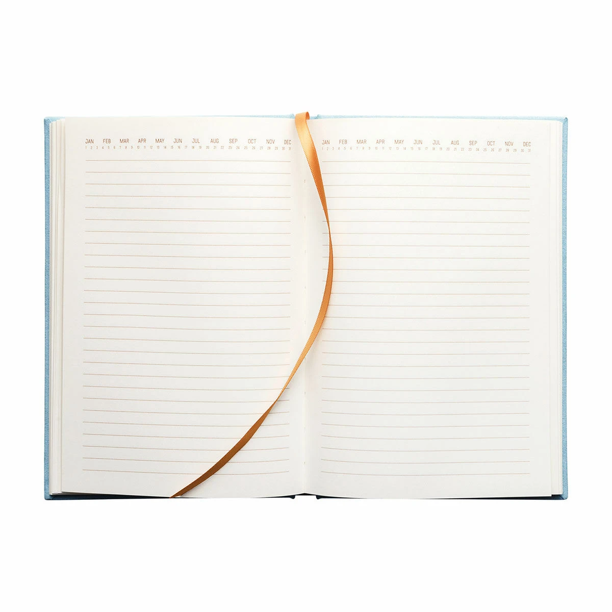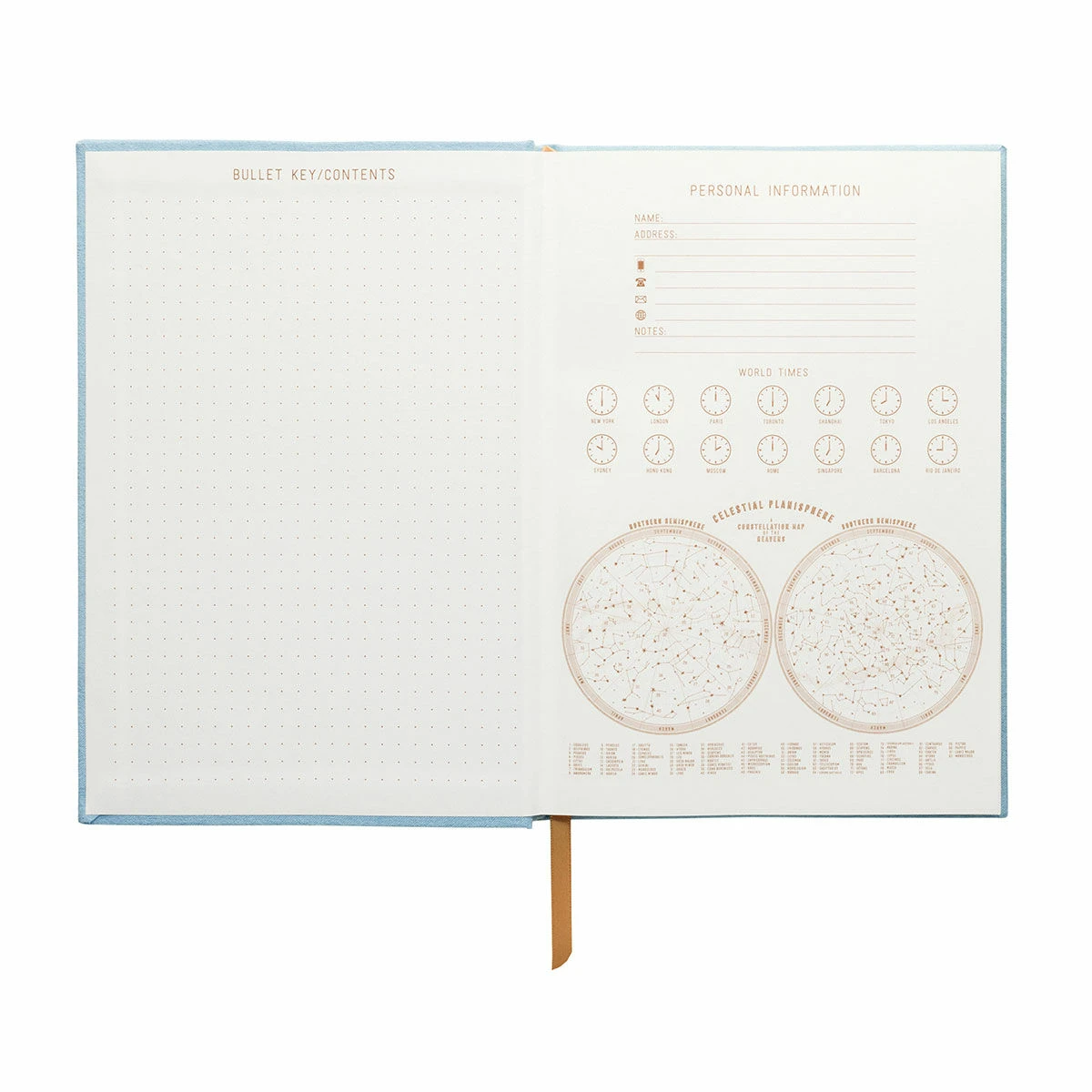 The front of this journal is a wonderful baby blue colour and made from soft touch suede. This is decorated with gold foiled arches and dots. This journal is the perfect balance of form and function and features 160 lined pages. There is helpful information in the front such as the times of the world and different star patterns. Each page features the months and dates across the top of the page allowing you to keep track of the day you made your notes. It is complete with a ribbon, so you never lose your page. At the back of the journal there is a pocket for you store receipts, notes and more.