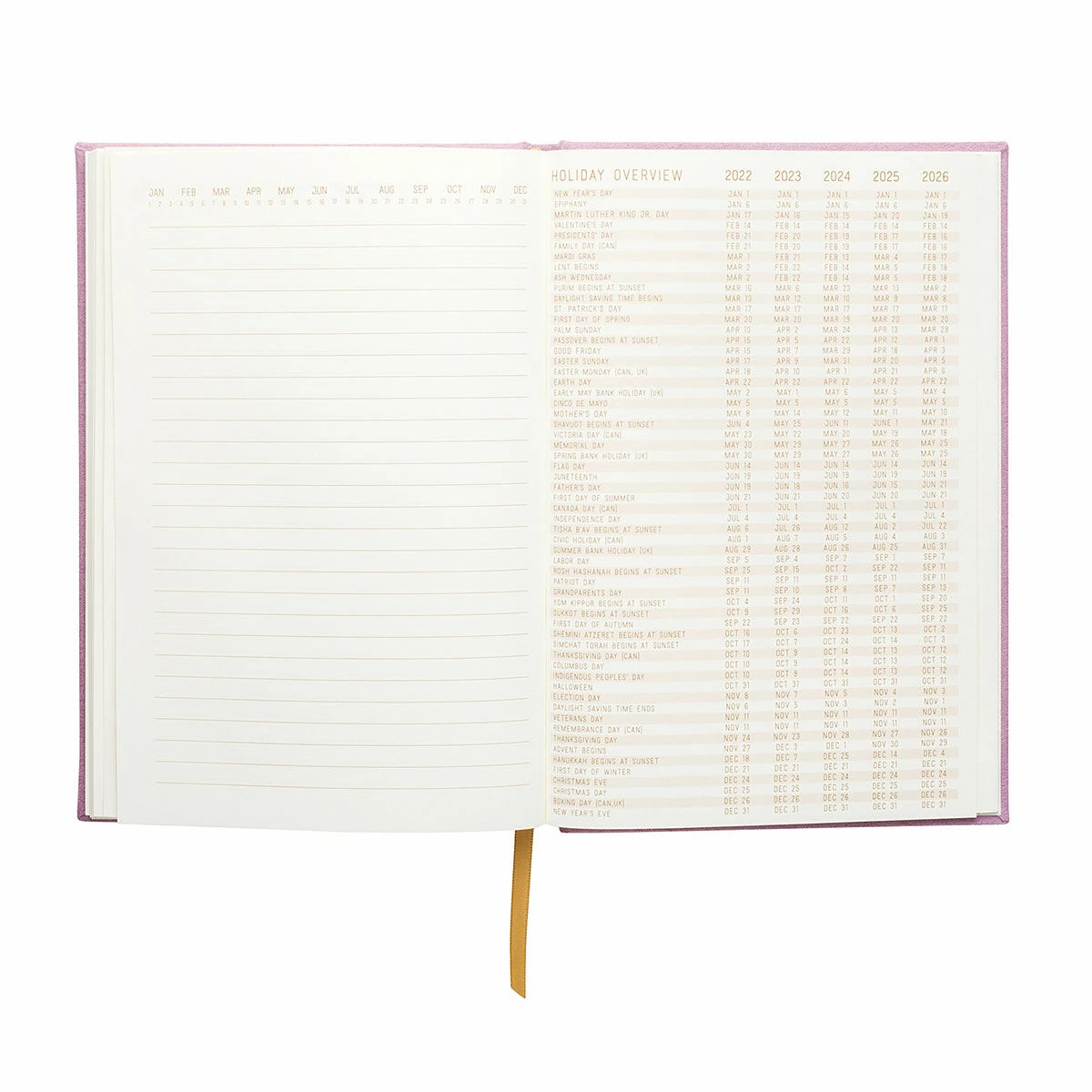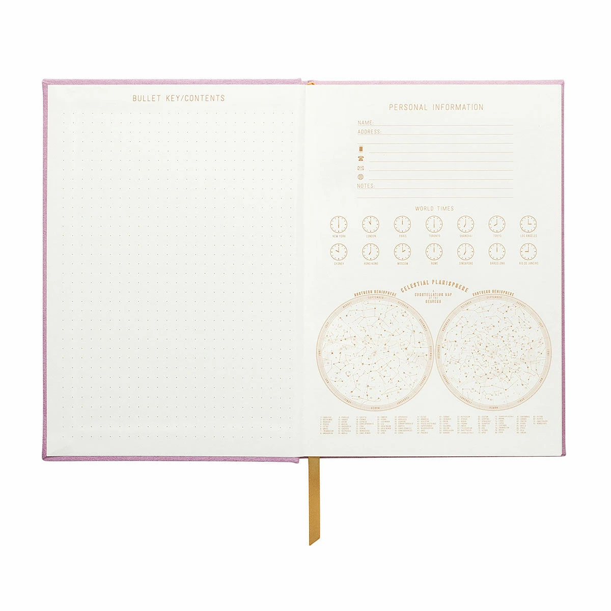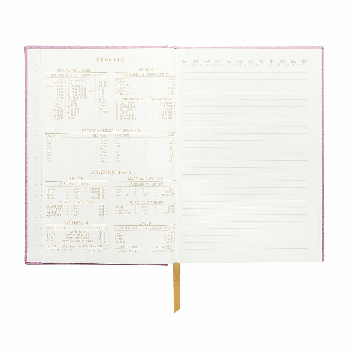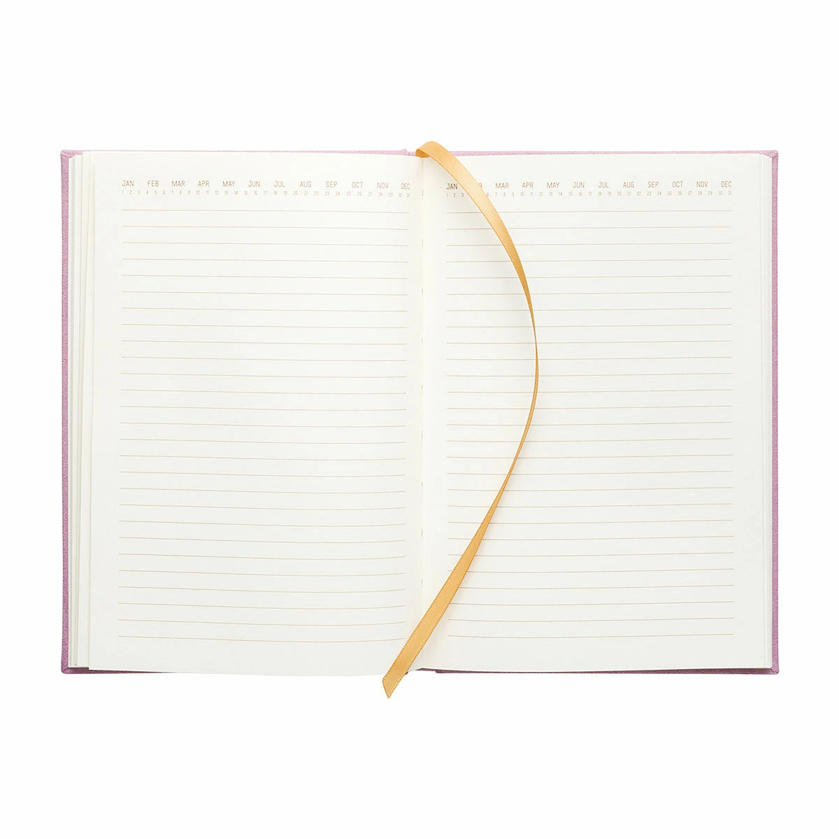 The front of this journal is a wonderful pale lilac colour and made from soft touch suede. This is decorated with a gold foiled text which reads ‘NOTES’. This journal is the perfect balance of form and function and features 160 lined pages. There is helpful information in the front such as the times of the world and different star patterns. Each page features the months and dates across the top of the page allowing you to keep track of the day you made your notes. It is complete with a ribbon, so you never lose your page. At the back of the journal there is a pocket for you store receipts, notes and more.