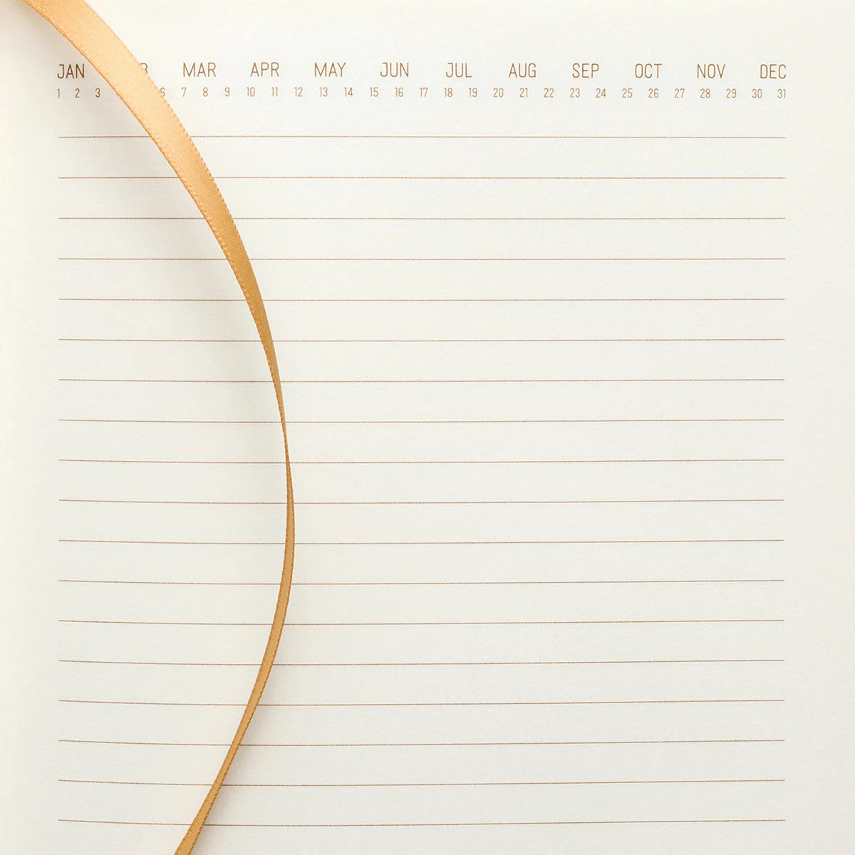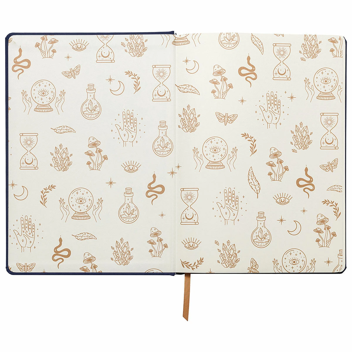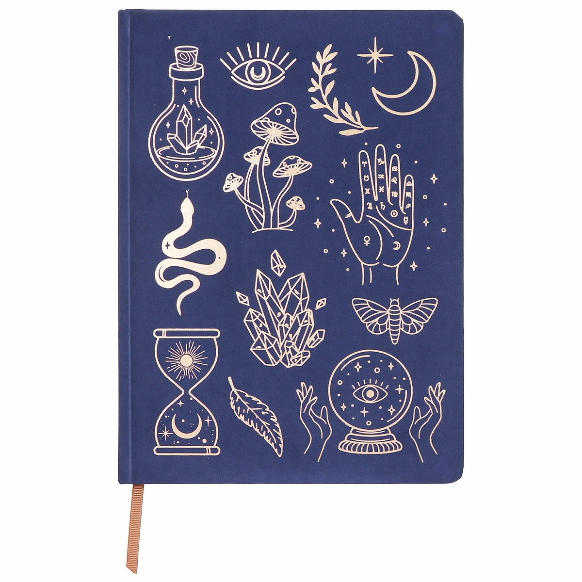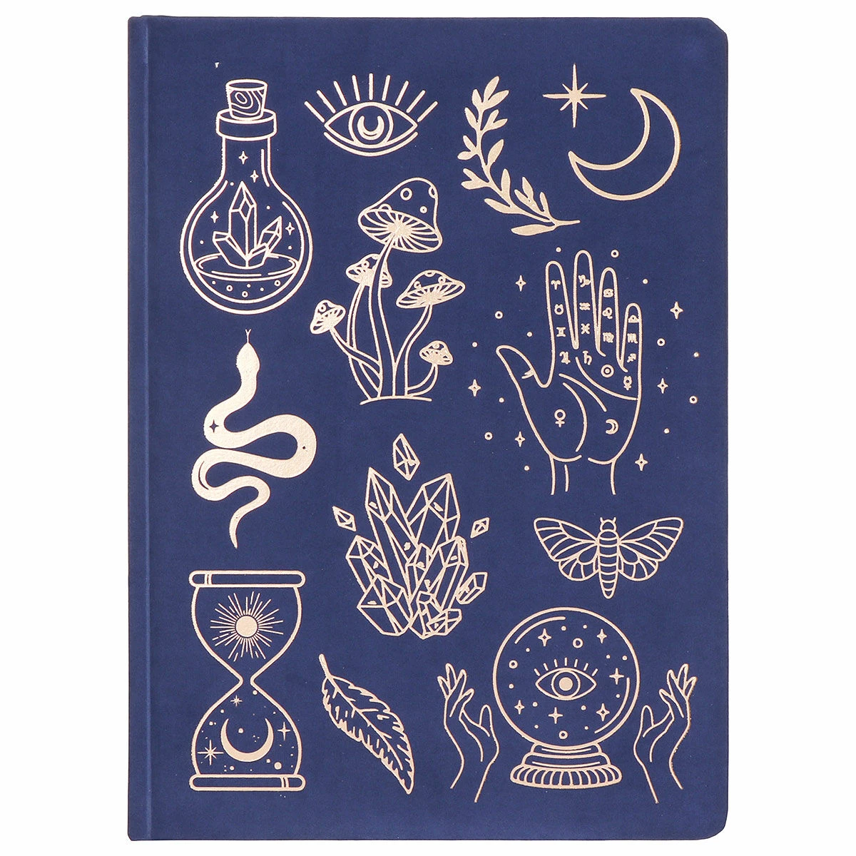 This navy soft suede covered notepad has been designed with spiritualism in mind. It features a range of mystic icons from crystal balls to mushrooms, all golden foiled to add a shimmer to the splendid design. This large journal features 200 lined pages. Each page features the months and dates across the top of the page allowing you to keep track of the day you made your notes. It is complete with a ribbon, so you never lose your page.