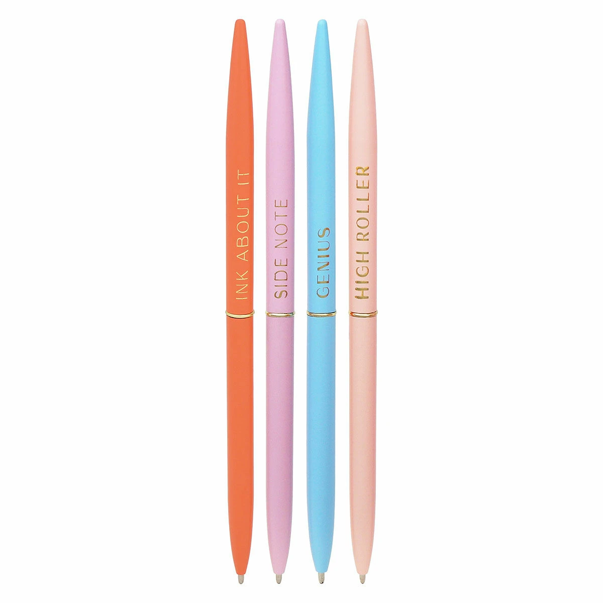 Each of the pens in this set have a sassy caption written in a gold uppercase font. These include ‘Genius’, ‘Ink About It’, ‘High Roller’, and ‘Side Note’. The text is set upon a coloured pen and each ball point pen writes in black ink, perfect for filling out forms and making notes of any kind. As you take notes, write to-do lists or journal, you will find that these smooth-flowing colourful pens help you write through the day with ease.