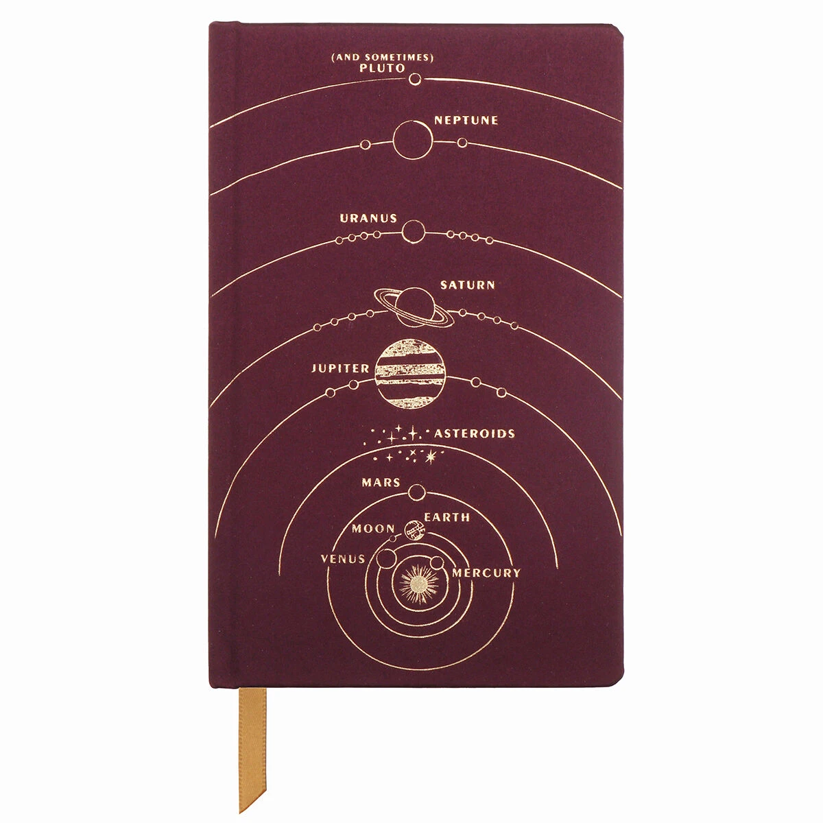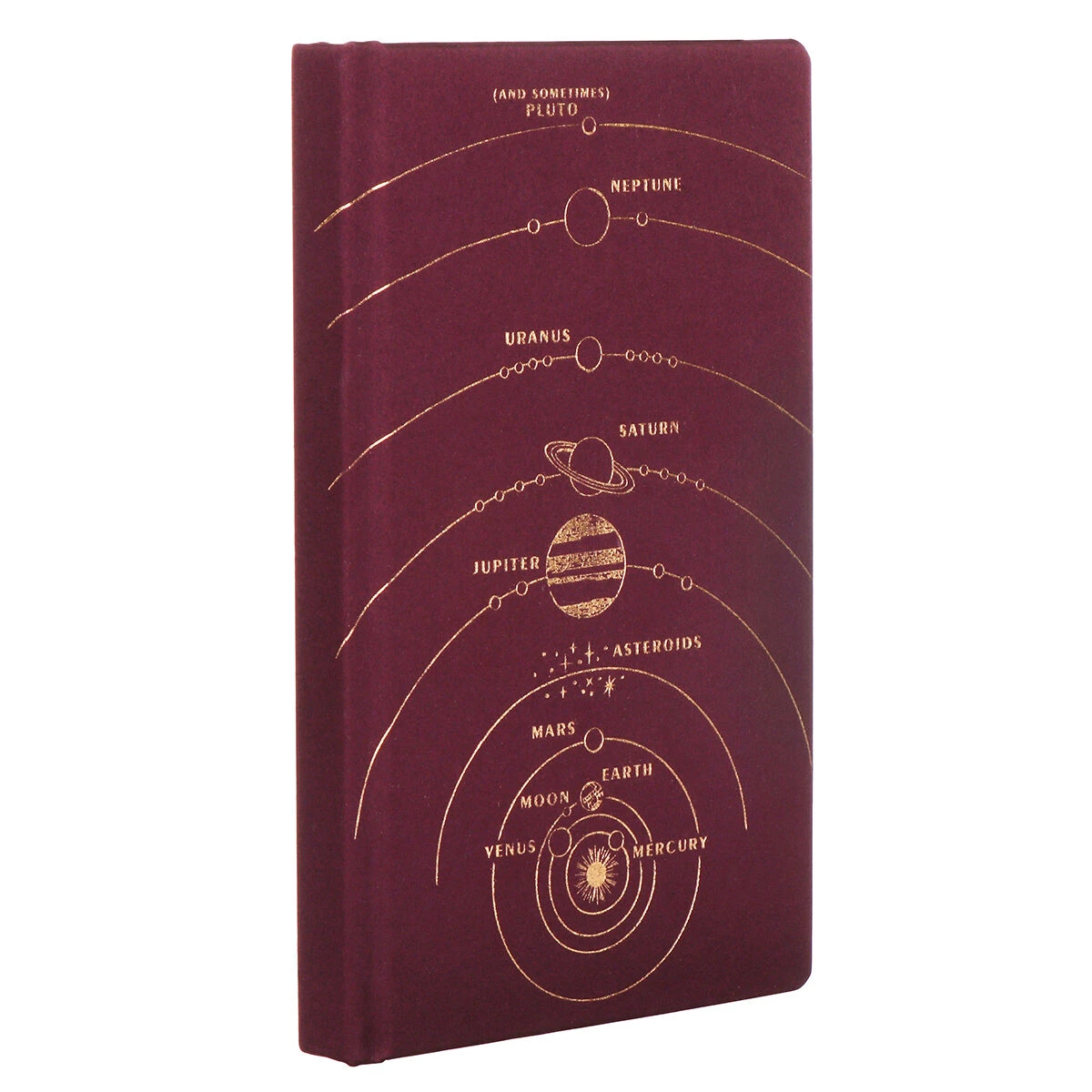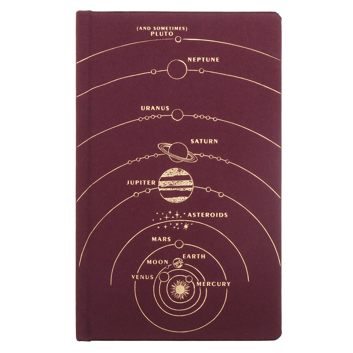 This maroon hardback book has a fabric cover which is decorated with shimmering golden planets in the solar system and the names of each planet. This notepad features 240 lined pages with helpful information in the front such as the times of the world and different star patterns. Each page features a heading ‘Subject’ and space for the date. It is complete with a golden ribbon, so you never lose your page.