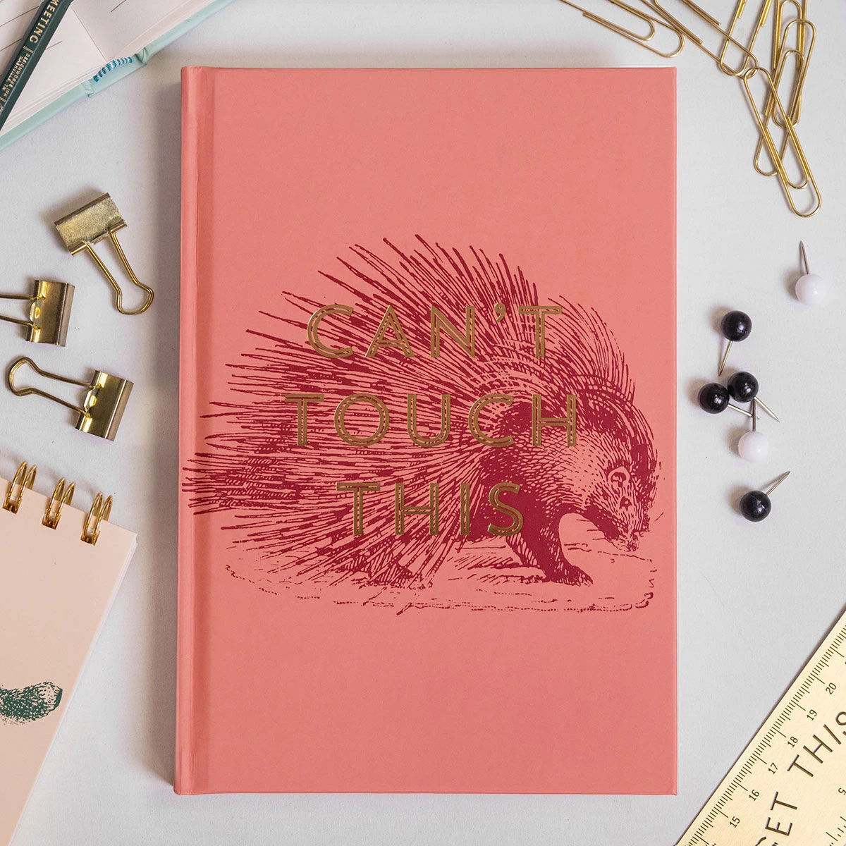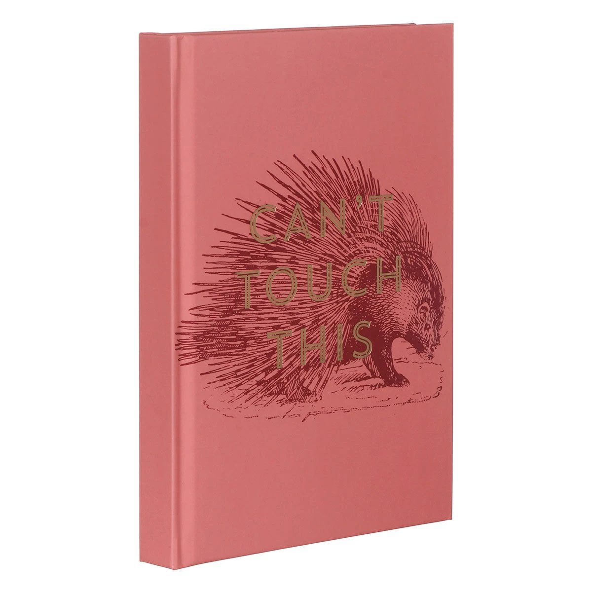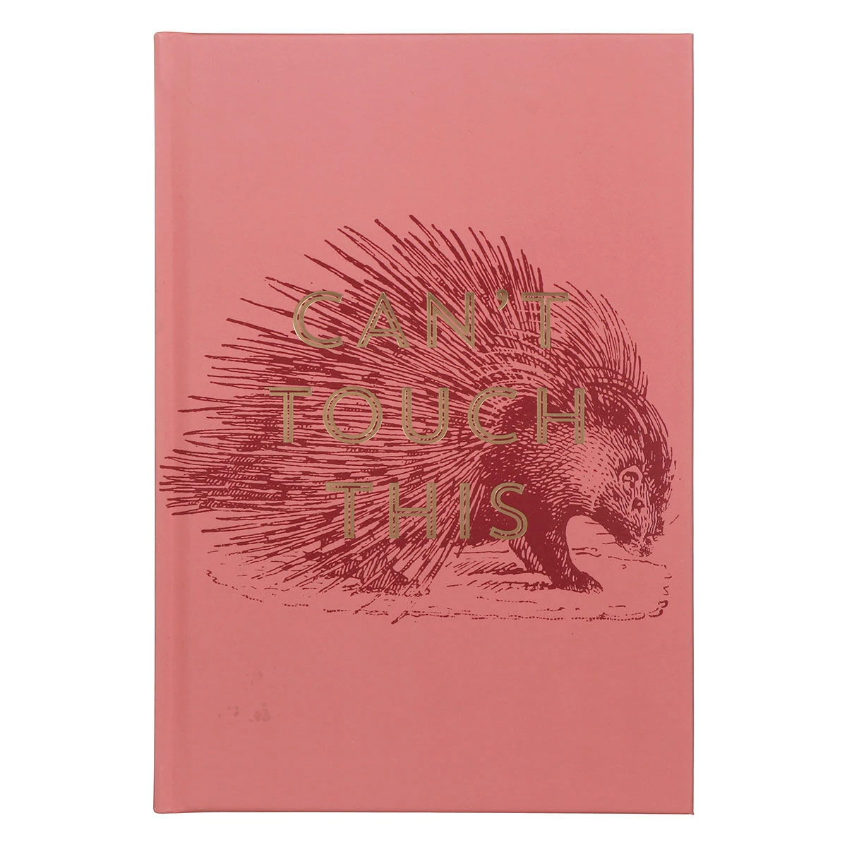 This matte dark pink journal features a gorgeous, illustrated porcupine, complete with shimmering gold uppercase writing which reads ‘CAN’T TOUCH THIS’. The journal features 240 lined pages with helpful information in the front such as the times of the world and different star patterns. Each page features a heading ‘Subject’ and space for the date. It is complete with a deep pink ribbon, so you never lose your page.