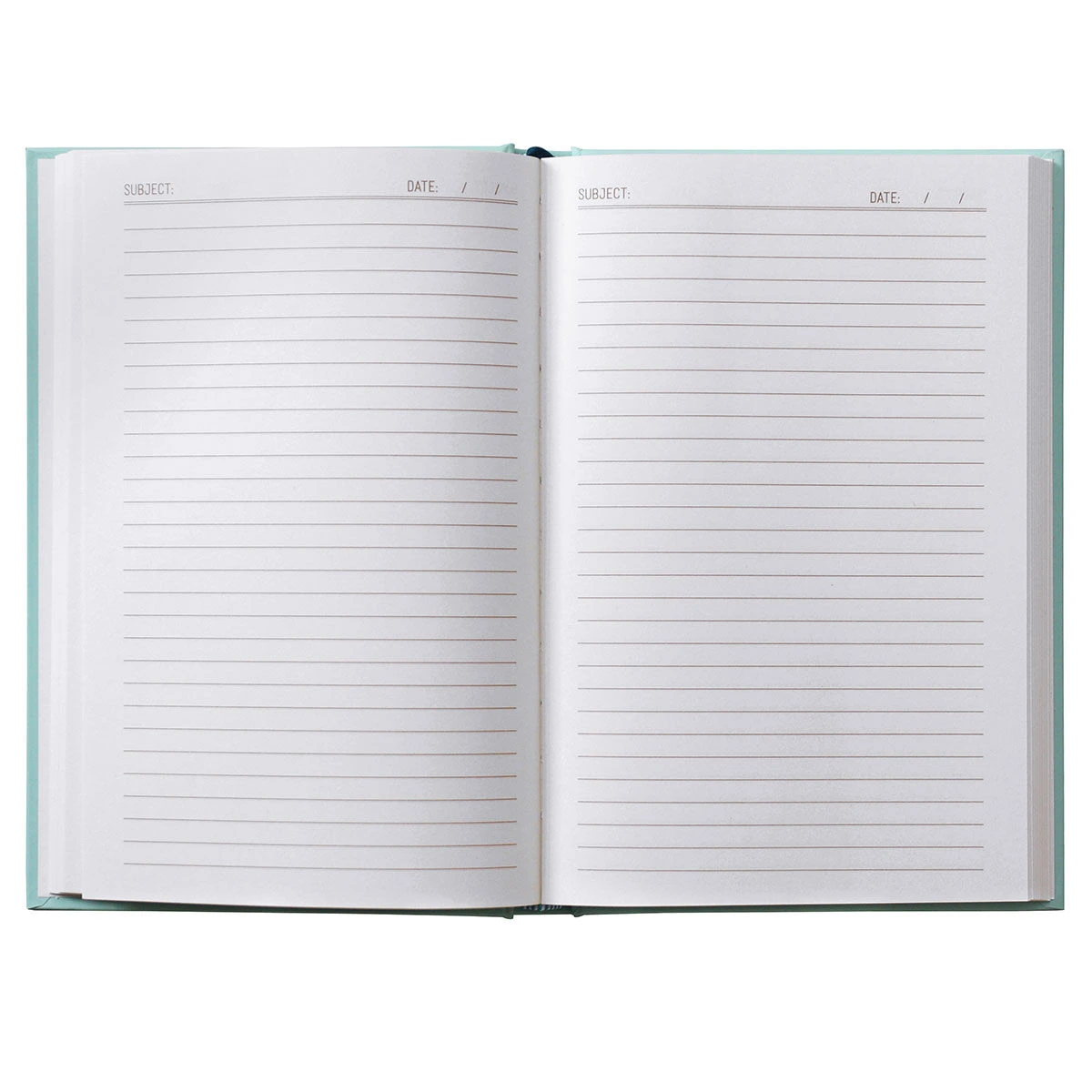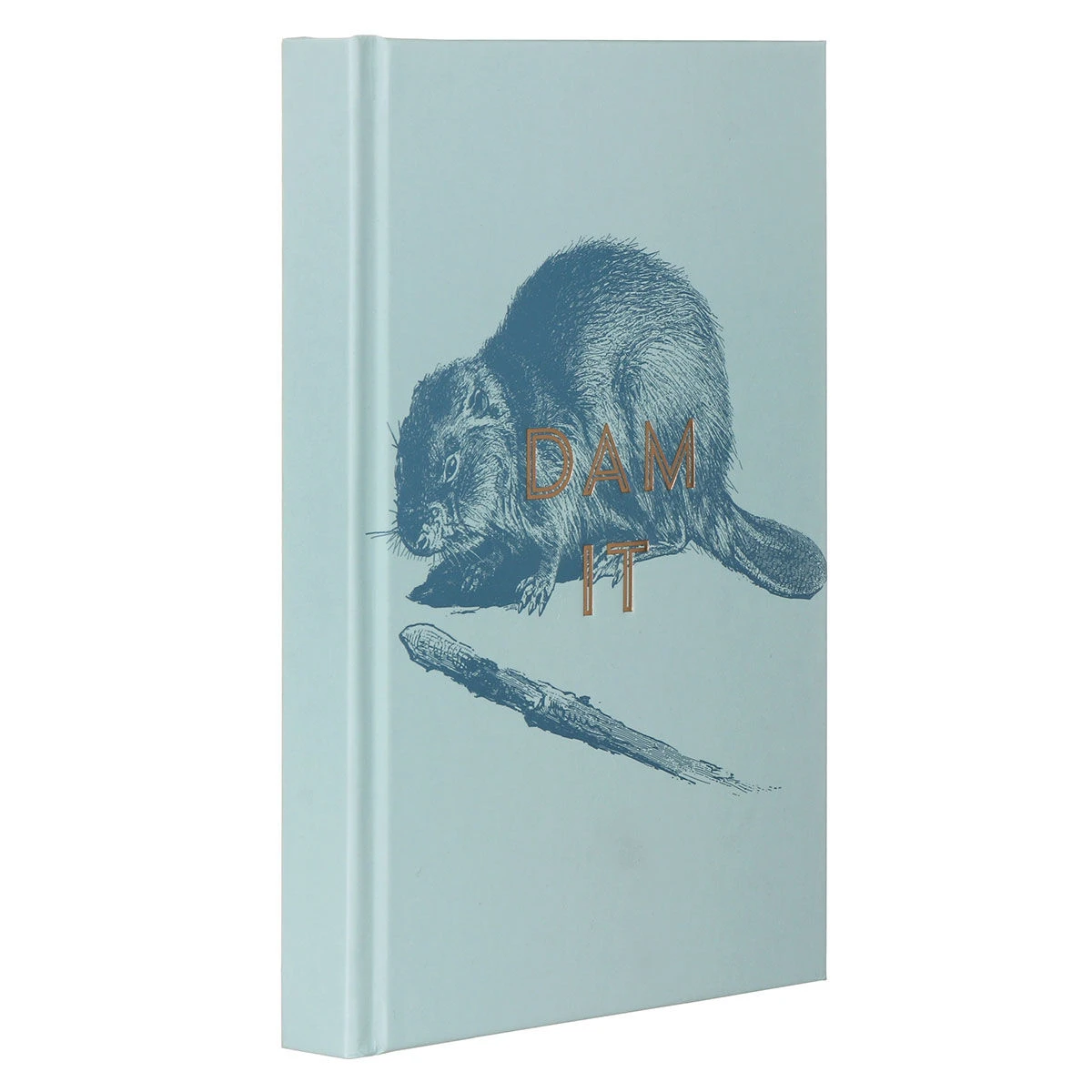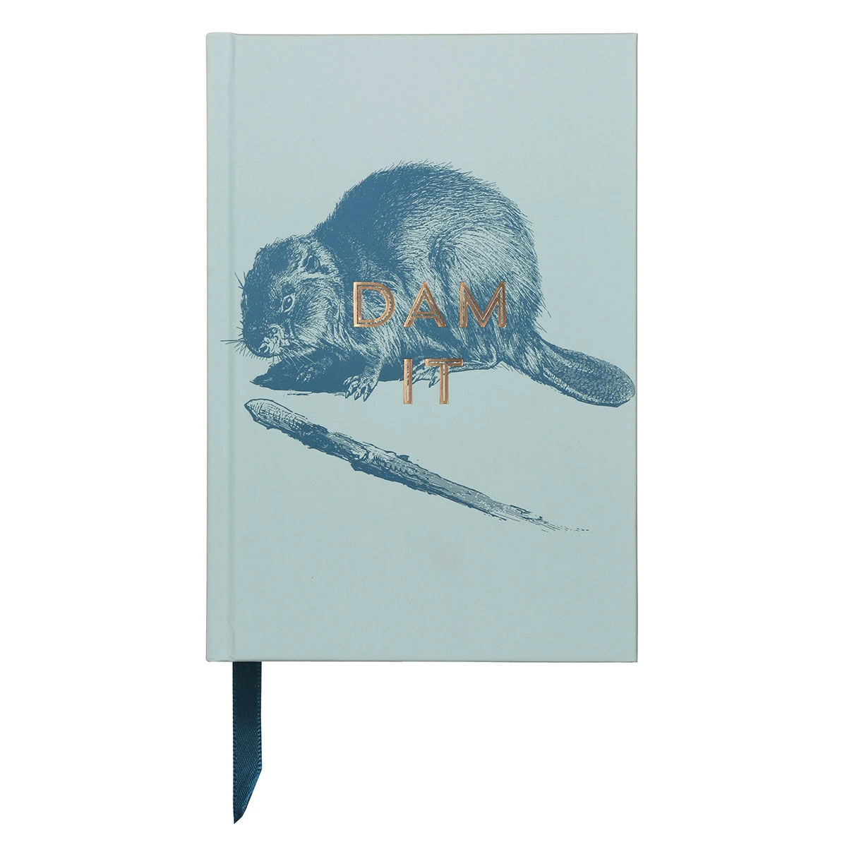 This matte green journal features a gorgeous, illustrated beaver, complete with shimmering gold uppercase writing which reads ‘DAM IT’. The Journal features 240 lined pages with helpful information in the front such as the times of the world and different star patterns. Each page features a heading ‘Subject’ and space for the date. It is complete with a blue ribbon, so you never lose your page.