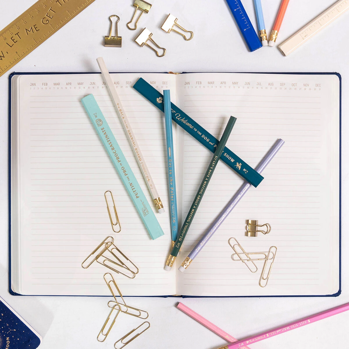 This set of pencils, in blues and greens, are each individually designed with different stylish text written in a golden foil such as ‘Back to the drawing board’ and ‘Get to the point’.