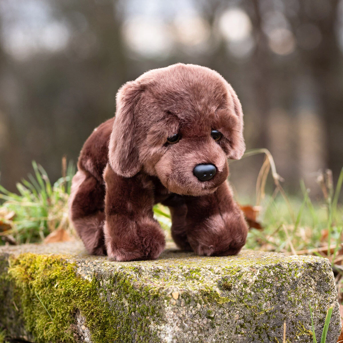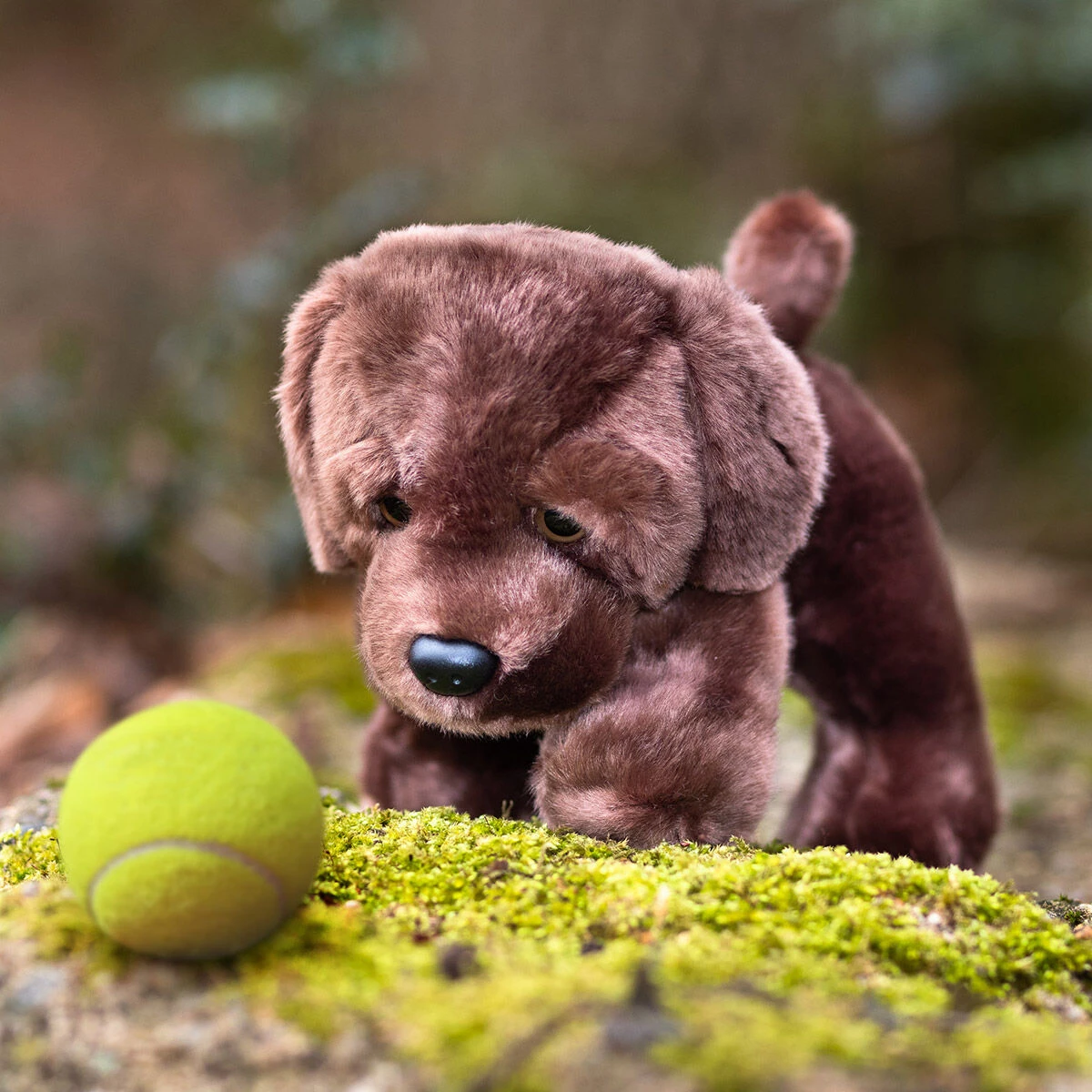 This charming little Labrador is captured in magnificent detail with striking beady brown eyes, a glistening black button nose, and velvety soft floppy ears.