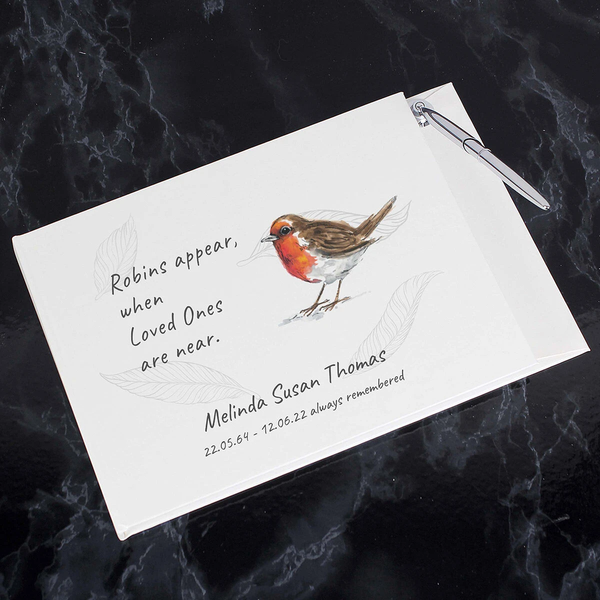 This heartfelt book of condolence features a soft linen texture hardback cover adorned with a beautiful, red-crested Robin and the heartfelt words, ‘Robins appear when loved ones are near’.