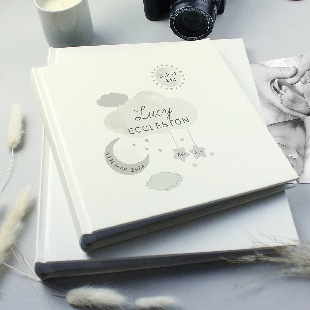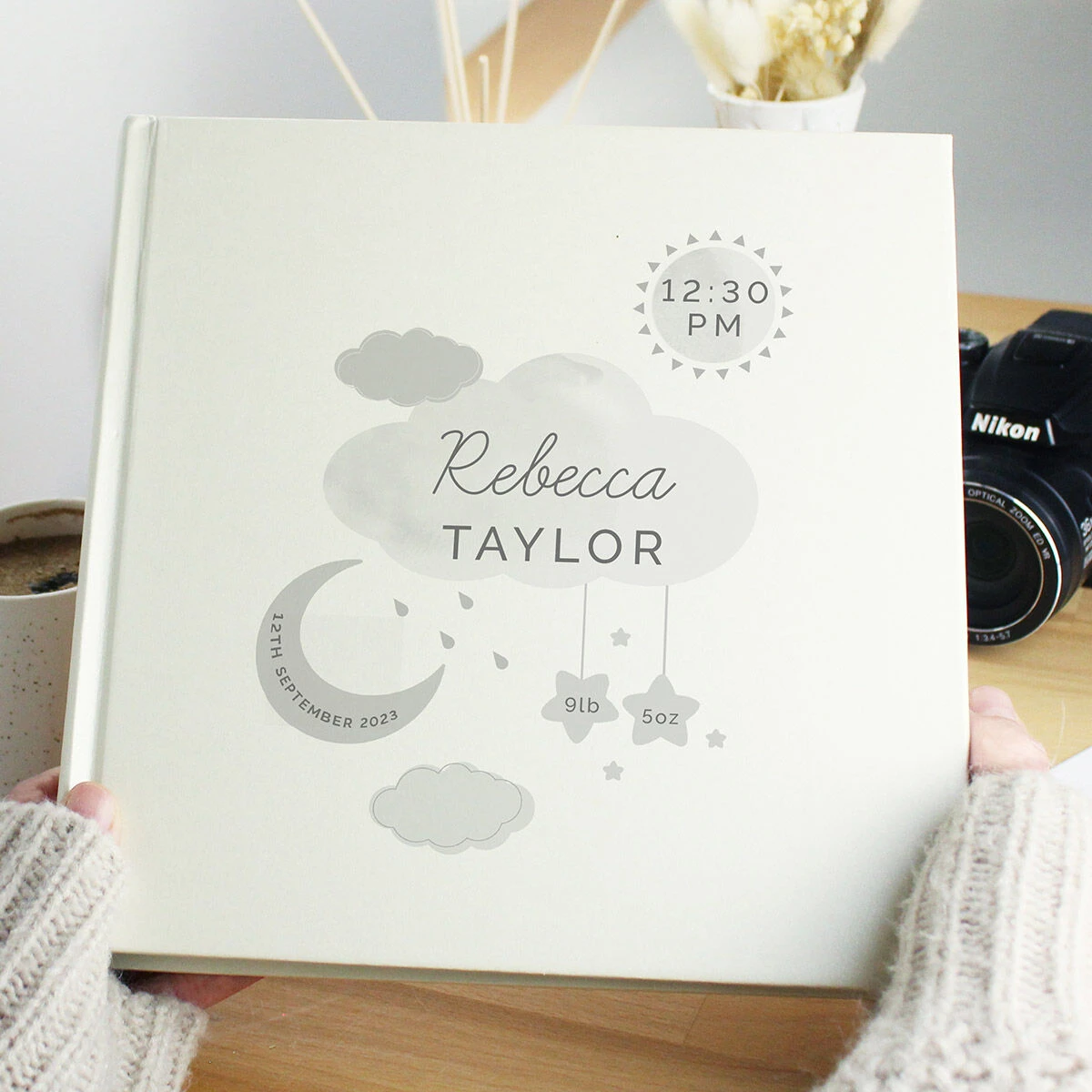 Designed with a cream cover, the front features a grey illustration showing a sun, clouds, a moon and stars, all of which can be personalised with the name, weight and time and date of your baby’s birth.
