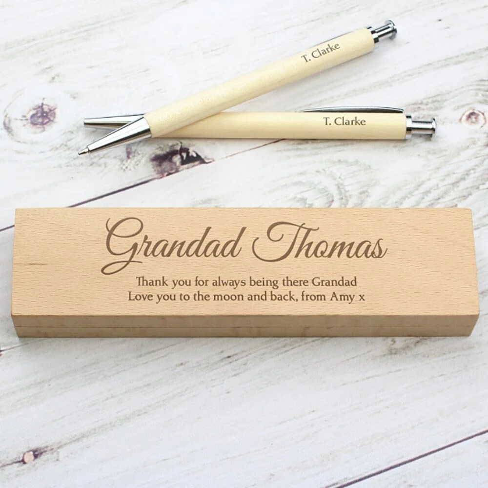 Made from wood, the pen writes in blue ink and the pencil comes with £ 0.5mm HB refills. Both feature a chrome clip and can be personalised with a name of your choice. They are presented in a beech wood box, which has hinged lid and can be personalised with three lines of text, allowing you to add an extra special, unique touch.