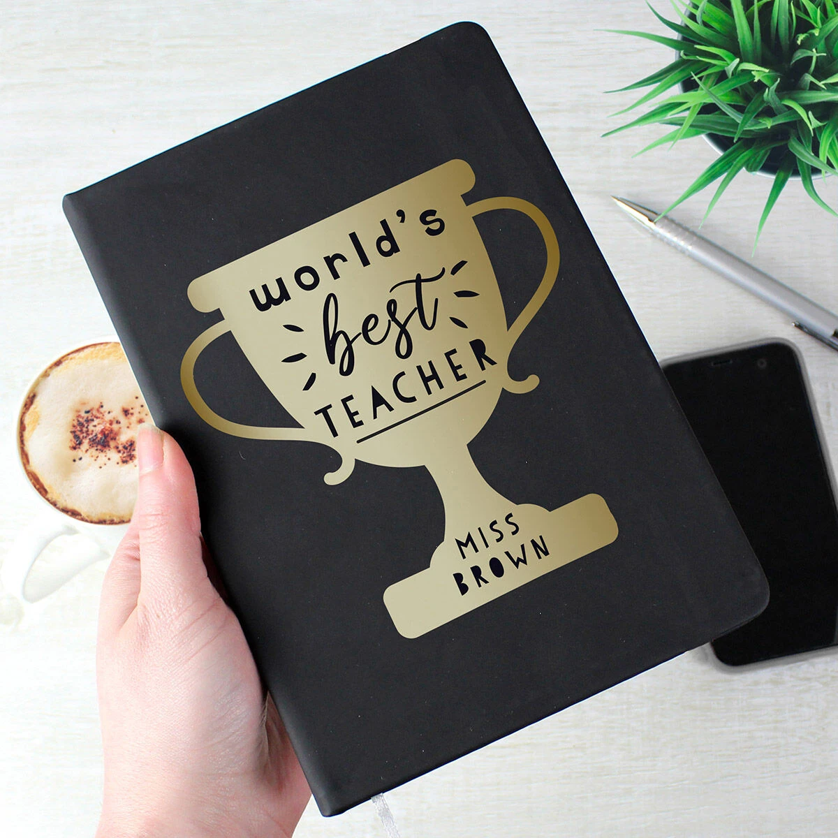 Personalised ‘World’s Best Teacher’ Trophy Black Hardback A5 Notebook