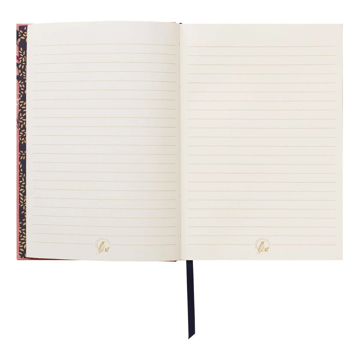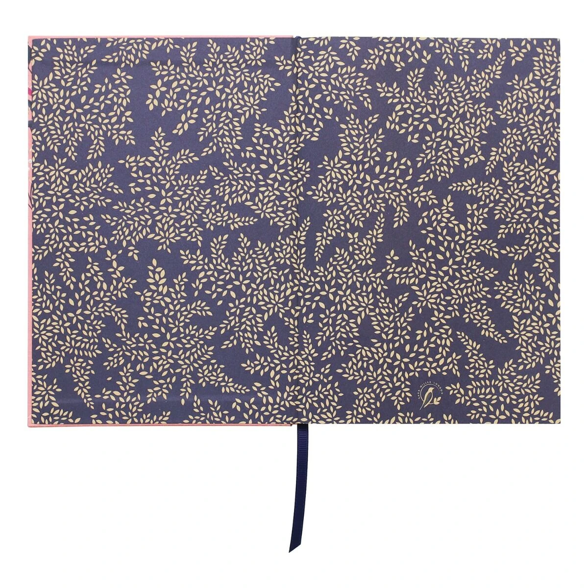The ruled journal is A5 in size, giving you plenty of space to draw, doodle and tick off a to-do list. The journal has a fabric cover which is soft to the touch and each of the 200 lined pages has gold gilt edges, adding a touch of opulence to the design. The design is set against a coral pink background and shows two colourful birds who are perched with flowering blooms and little insects, such as ladybirds and bees, surrounding them, with luscious lemon trees in the orchard. The design is accentuated with delicate gold foil details that add another dimension to the illustration. The front and back interior covers of the journal features a motif of leaves set against a deep navy background, a beautiful contrast to the vibrant colour scheme of the exterior.