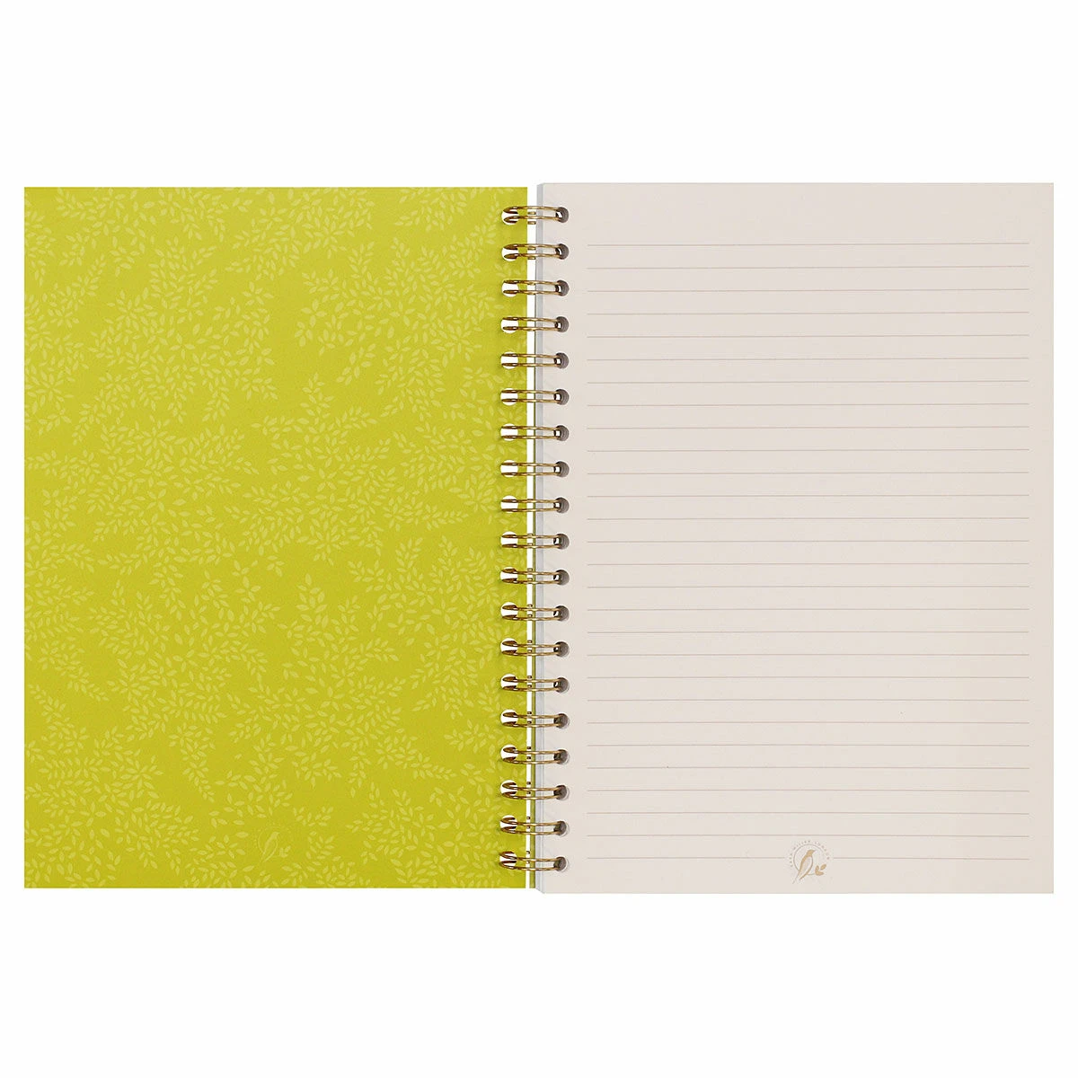 The design is accentuated with delicate gold foil details that add another dimension to the illustration. The front and back interior covers of the notebook features a motif of leaves set against a vibrant lime green background, a beautiful contrast to the deep colour scheme of the exterior.