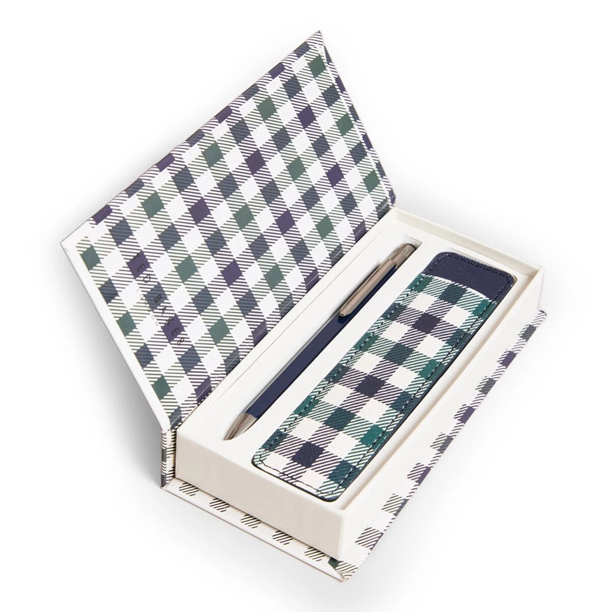 The navy pen twists to reveal the tip which writes black ink, and it has a black stylus at the other end, perfect for doodling on your tablet. The pen comes packaged in a faux-leather sleeve for storage, decorated in a ‘house check’ gingham pattern in shades of navy and green on a cream background. With a matching gift box, it makes a brilliant gift for Dads, brothers, and boyfriends, perfect for a variety of situations!
