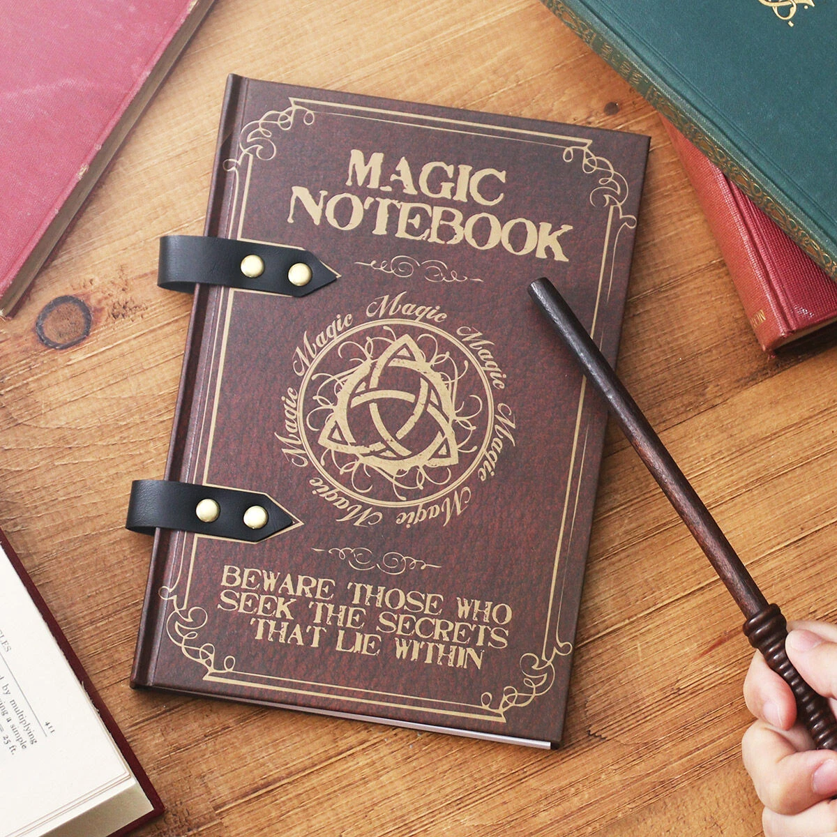 The hardback book has a brown background in in gold has a number of decorative details giving it that âmagicalâ feel. On the top âMAGIC NOTEBOOKâ is written and at the bottom is goes on to say âBEWARE THOSE WHO SEEK THE SECRETS THAT LIE WITHINâ. On the side there are 2 leather straps which hold a wand shaped pencil in place. The pages inside are lined and even have diagrams of how to conjure spells at the bottom of each page.
