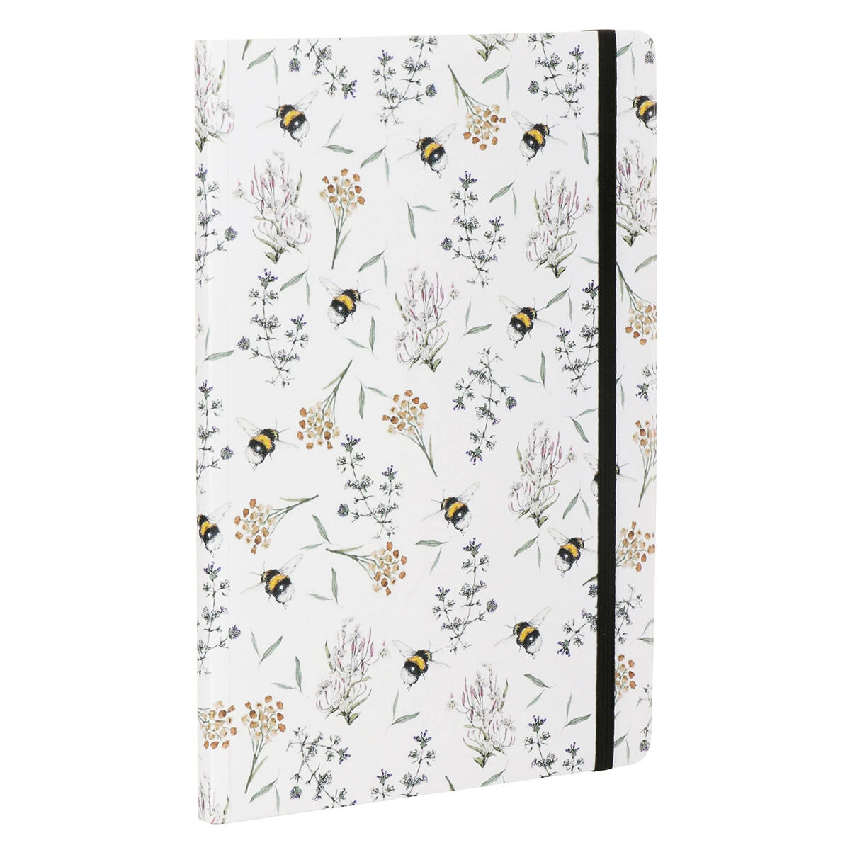 The front cover of this stylish notebook features a pattern of buzzing bumblebees that are punctuated by honeysuckle and other wildflowers, which have been depicted in glorious watercolour on a white background.