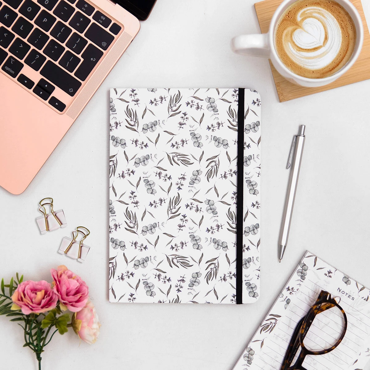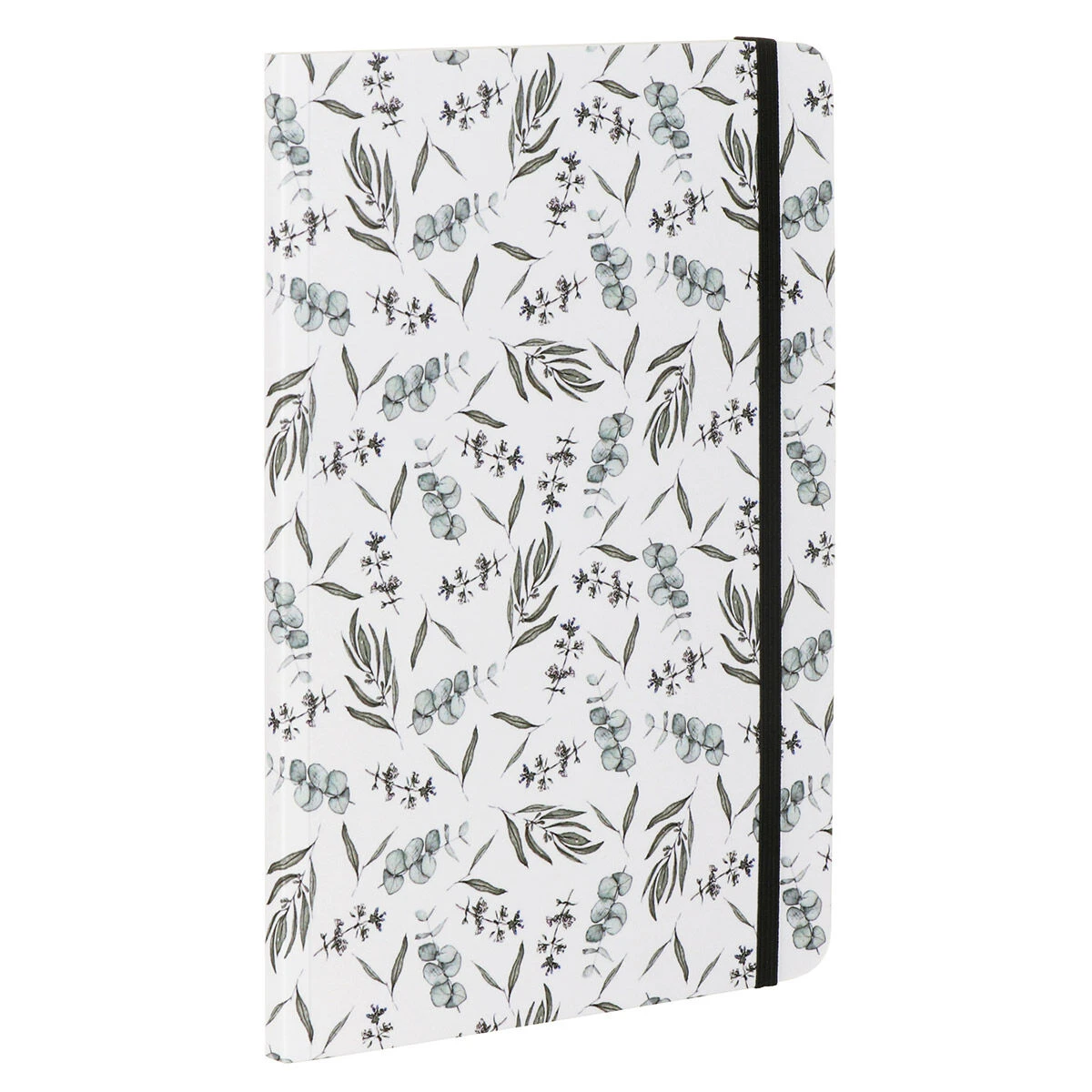 The front cover of this stylish notebook features a pattern of eucalyptus leaves and an assortment of botanicals that have been depicted in glorious watercolour, on a white background.