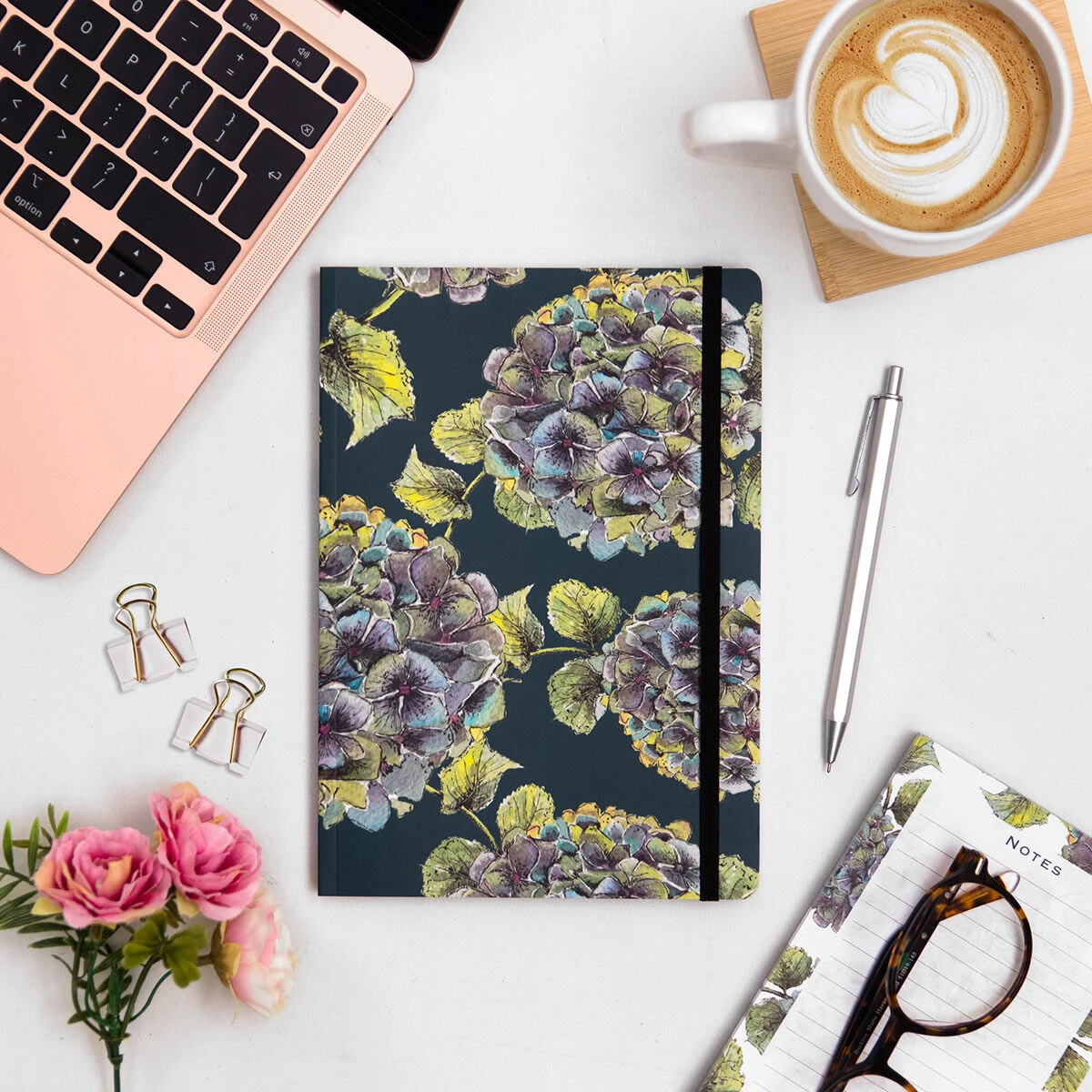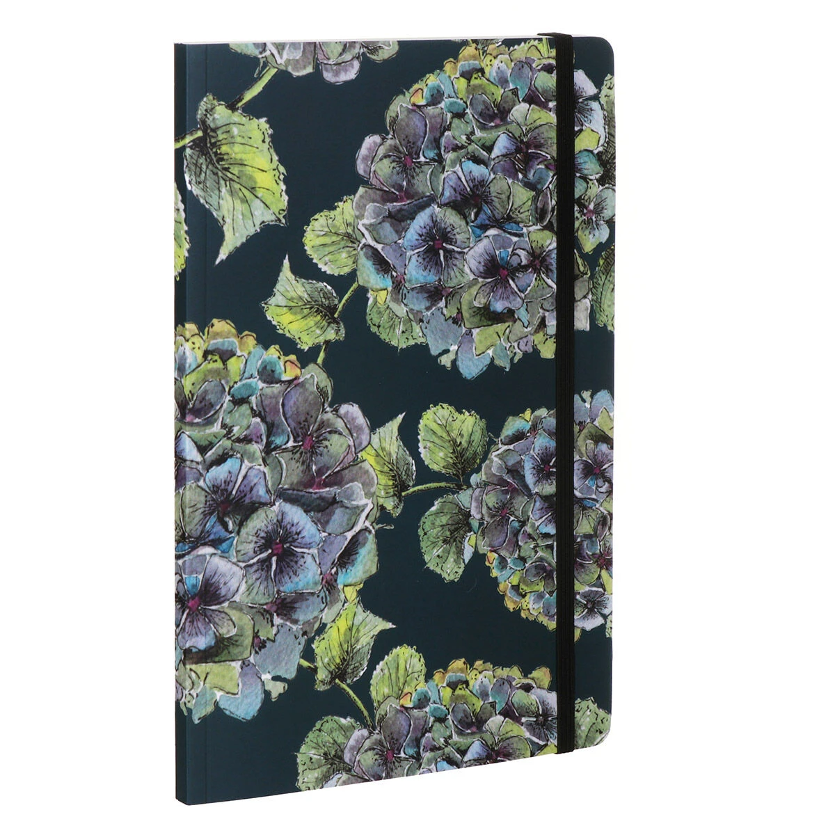 The front cover of this stylish notebook features a pattern of blooming hydrangeas that have been depicted in glorious watercolour, on a teal background.