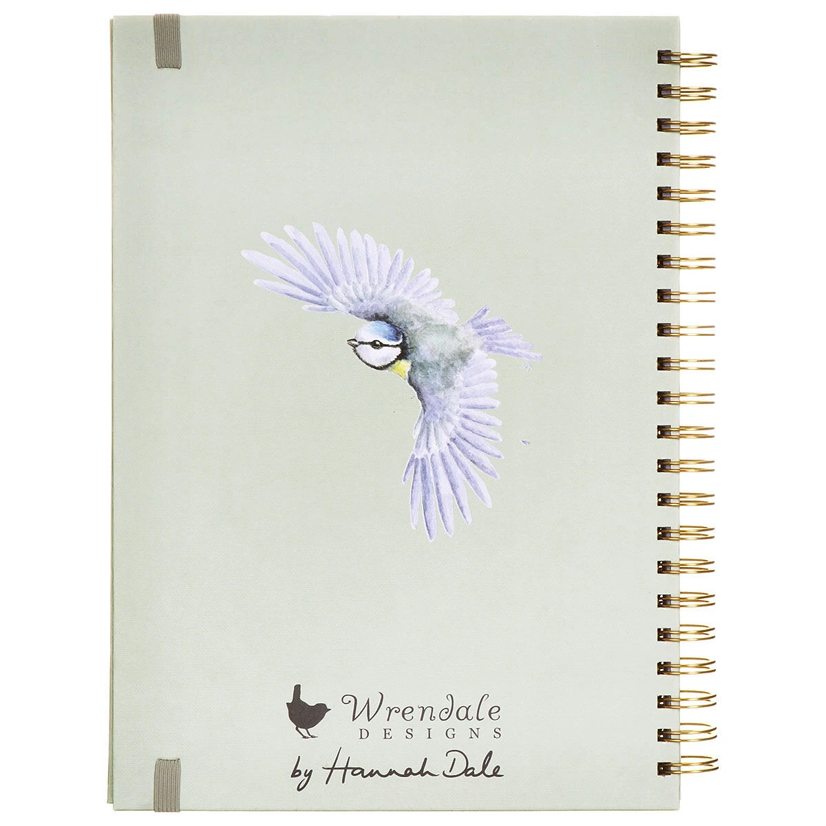 Set against a beautiful sage green background, the front of this notebook is decorated with one of Hannah Dales beautiful illustrations, ‘Bon Appétit’. This design depicts a bird feeder hanging from a branch filled with bird food. Surrounding the feeder is a flock of garden birds including blue tits and great tits all trying to get a quick snack! The design is painted in the soft watercolour style of artist Hannah Dale, depicted with intricate detail and surrounding the illustration are speckles of black paint, in a way that is synonymous with the Wrendale brand. The back cover features a wonderful illustration of a blue tit in flight with its wings spread.